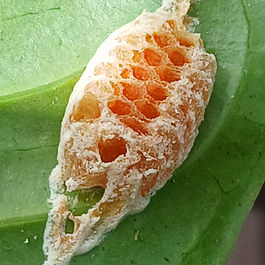 Pterygota. Winged and once winged insects. This is a Praying Mantis egg case called "ootheca". It is a foam-like structure that hardens to protect the young and is created by the female, The case can contain between 50 and 400 eggs depending on the species and they may be attached to plant stems, twigs, fences or walls.. In this case a leaf blade. When hatching the young disperse quickly, feeding on small soft bodied insects, like aphids, they can also be cannibilistic. Eating aphids of course means they are beneficial to the Gardener.
