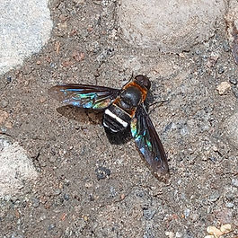 Ligyra tantalus. Beefly. Strawberry Farm, Tupi. Adults feed on flower nectar and pollen and therefore may play an important role in pollination. Most bee flies are parasites, feeding externally on bee and wasp larvae. Even the larvae may feed on other parasites.